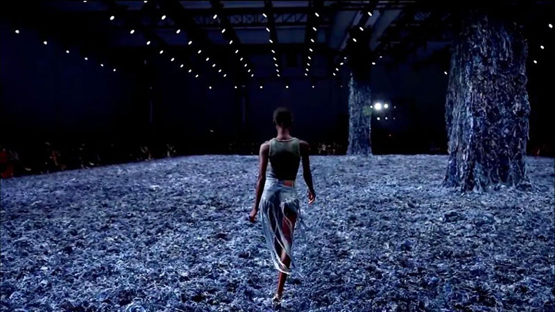 Diesel2025春夏系列時(shí)裝秀,以再生面料為靈感,借以宣揚(yáng)時(shí)裝的可持續(xù)性,使用了14,800公斤牛仔布廢料打造了一個(gè)極具視覺沖擊力的沉浸式秀場。不僅僅模特身穿的服飾是由回收印花絲巾、紗線等材料制作而成,現(xiàn)場這14800公斤牛仔廢料也都會在秀后重新回收利用制作服飾,藝術(shù)時(shí)尚與環(huán)??沙掷m(xù)完美結(jié)合。滿地的牛仔廢料,感官刺激的同時(shí)也是對末日一種藝術(shù)化表達(dá),當(dāng)然更是對模特臺步功底的考驗(yàn)。